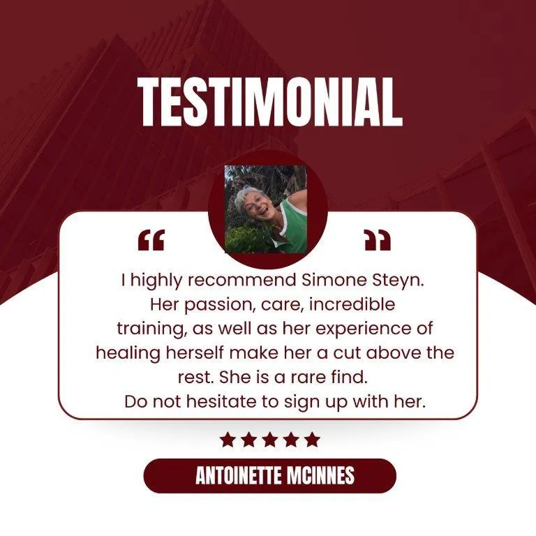 Simone is not only interested, she’s fully invested in me. She sees me, hears me; and it feels like she can feel my pain with me. I can’t thank you enough Simone - you’ve complimented and changed my life so much!"