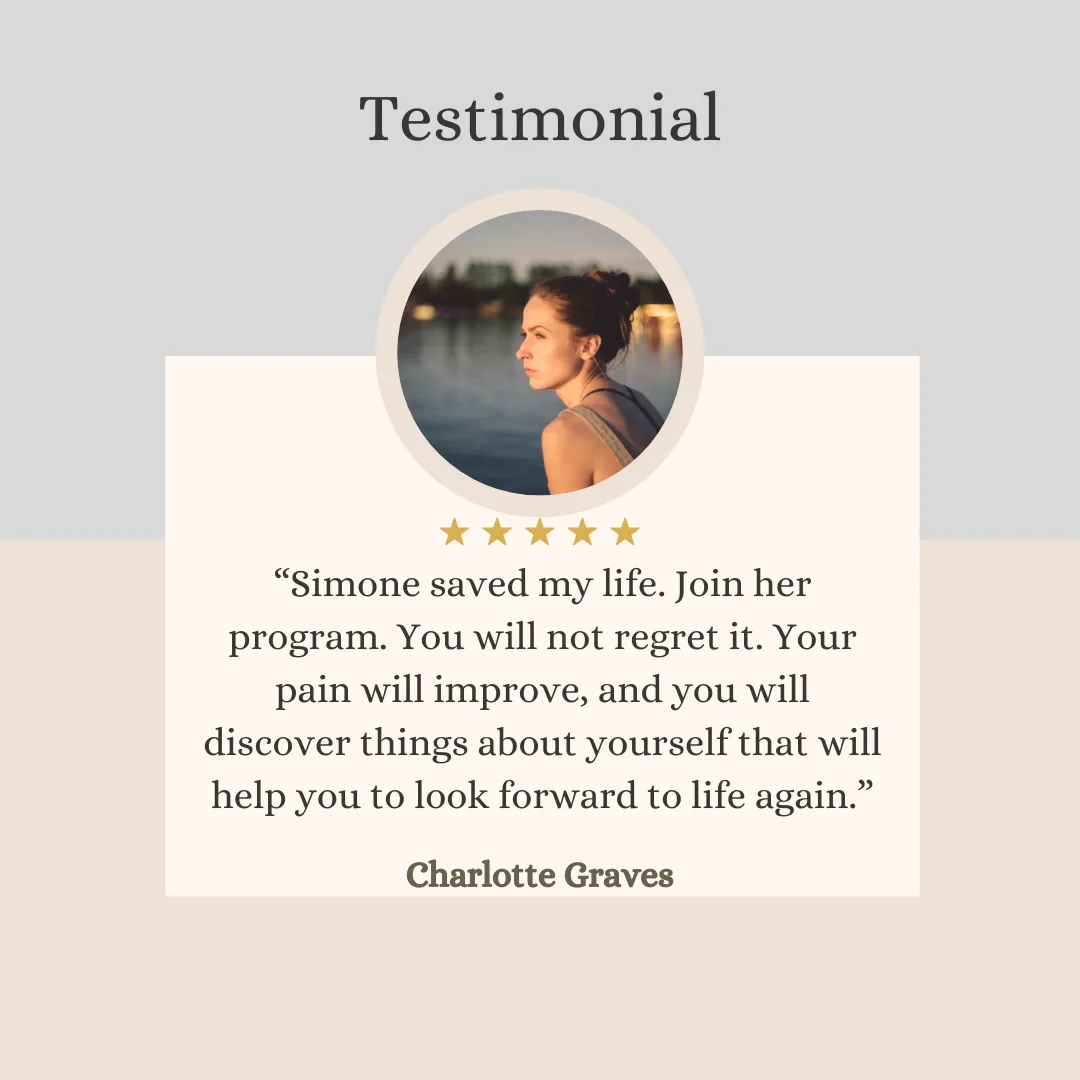 "I have struggled for years with unexplained pain and horrible symptoms that left doctors baffled and unable to help me. Working with Simone in her one on one mind body coaching sessions has helped me so, so much! For the first time in a decade I understand the role my brain is playing in my symptoms and she is so compassionate and gentle in her approach. For the first time in my life I feel understood and empowered. Thank you beautiful Simone."