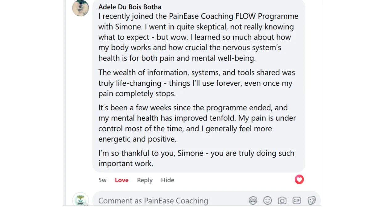 "Finally someone that has also walked this road of pain and suffering. Simone gets it and she is good at teaching this brain rewiring stuff and helped me implement it into my daily life. I am so grateful for all your guidance, thank you Simone and I highly recommend her RISE coaching program if you have fibromyalgia."