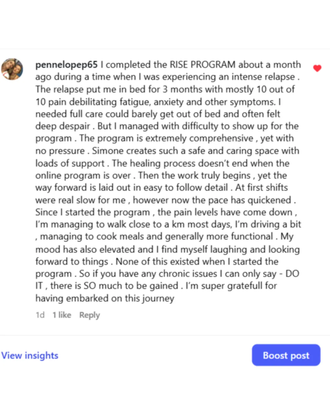 The RISE Program is a mind-body healing journey designed for people living with neuroplastic mind-body syndromes. This program whether taken in a group context or in 1-1 sessions, guides you step by step to calm your nervous system, retrain pain pathways, release stored emotional tension, and rediscover the resilience within you. This program is for anyone ready to move beyond symptom management and begin the path toward lasting recovery and freedom from chronic neuroplastic pain.